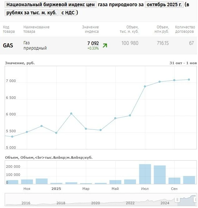 Wholesale gas prices in the United States continue to be among the lowest in the world. November 2025 Henry Hab price as of 09.10.2025 was 3.28 USD/mmBTU, which is equivalent to 9.75 RUR / 0.44 AED / 0.85 CNY / 9.98 INR / 12.0 US cents per cubic meter of natural gas. No QoQ change.