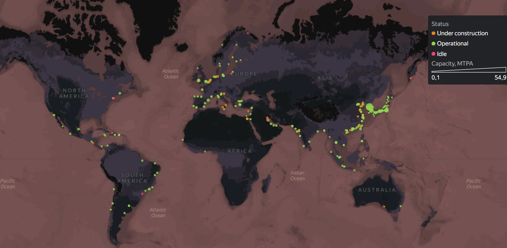 Interactive map of LNG plants with description of train status, design characteristics, owners, and commissioning dates.